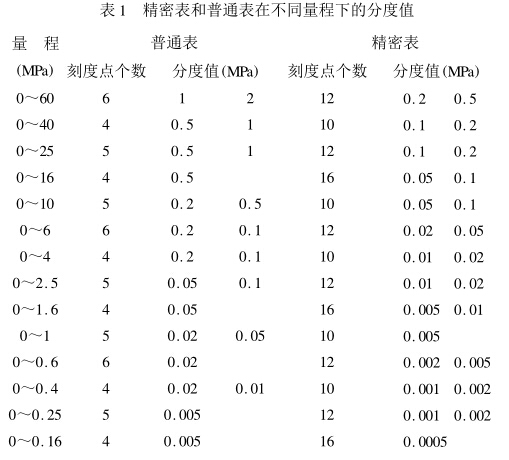 根據(jù)現(xiàn)有壓力表進行統(tǒng)計,得到精密表和普通表在不 同量程的分度值分別如表1所示。