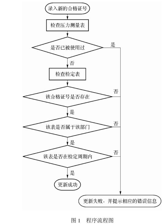 在以往的管理中,常有發(fā)現(xiàn)臺(tái)賬數(shù)據(jù)與現(xiàn)場實(shí)際 情況不一致,也即假臺(tái)賬現(xiàn)象。為了杜絕此現(xiàn)象,就 要在車間更新壓力測量表中的合格證號(hào)時(shí)在程序上對其進(jìn)行多項(xiàng)驗(yàn)證,實(shí)現(xiàn)方法見程序流程圖(圖1)。