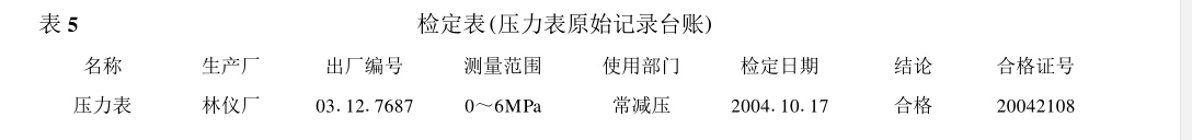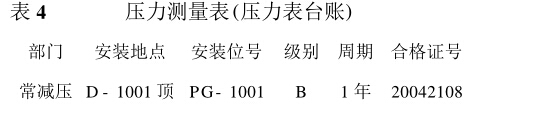 鑒于這種情況,我們考慮通過這套壓力表臺(tái)賬 管理技術(shù)程序解決分級(jí)管理的上述問題,即:壓力表 檢定合格后只需貼上合格證號(hào),合格證上無須分A、 B、三級(jí),只注明檢定日期而不是有效日期,檢定周 期在壓力表管理臺(tái)賬上按要求自動(dòng)顯示,計(jì)量中心 設(shè)置定期抽檢、考核制度,不定期地經(jīng)常到現(xiàn)場按壓 力表臺(tái)賬進(jìn)行檢查。這樣,因?yàn)闆]有級(jí)別的區(qū)分,安 裝人員也能減少了一道鑒別級(jí)別的工序而直接安裝 壓力表。因?yàn)榧?jí)別是根據(jù)安裝地點(diǎn)決定的,只需在 壓力測量表中增加“級(jí)別”與“周期”兩列,相應(yīng)地在 檢定表中刪去這兩列(見表4、表5)。這樣,在壓力 表臺(tái)賬中仍能體現(xiàn)出A、、三級(jí)壓力表,管理人員 可以根據(jù)這套臺(tái)賬管理系統(tǒng)進(jìn)行分級(jí)管理,以符合 計(jì)量管理的要求。