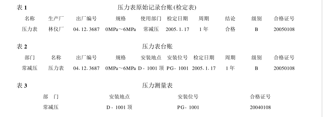 因壓力表原始記錄臺(tái)賬上一個(gè)合格證號(hào)對應(yīng)一 塊壓力表,在更新合格證號(hào)的同時(shí),壓力表出廠編號(hào) 也隨之自動(dòng)更新。這樣計(jì)量管理人員只需根據(jù)壓力 表臺(tái)賬對現(xiàn)場壓力表安裝情況進(jìn)行抽查,如發(fā)現(xiàn)合 格證號(hào)、出廠編號(hào)與臺(tái)賬數(shù)據(jù)不一致,即可要求該單 位立即整改,從而避免了將新檢定的壓力表合格證 號(hào)撕下貼于舊表上而不真的進(jìn)行更換的現(xiàn)象。