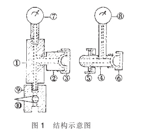 本閥門座由8部分組成,其結(jié)構(gòu)名稱是①三通體,②連接 體,③絲堵,④檢測三通體,⑤檢測三通體鎖母,⑥檢測絲堵, ⑦被檢壓力(負壓)表,⑧標(biāo)準(zhǔn)壓力(負壓)表,⑨系統(tǒng)控制閥, ⑩開關(guān)閥門扳手。見圖1。