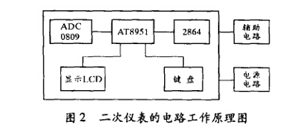 采用2節(jié)9 V電池并聯(lián)作為電源;選用小尺寸 液晶顯示板;采用成品化機殼;使用薄膜鍵盤,5 個鍵為:預(yù)置、回放、定位、置數(shù)和測量,基本滿 足測試需要。二次儀表電路部分的原理如圖2所 示。圖中ADC0809為A/D轉(zhuǎn)換器,將從一次儀表 獲得的模擬信號轉(zhuǎn)化為數(shù)字信號;AT8951為低耗 高性能單片機;2864為E2PROM電可擦寫存儲器, 存儲程序及測試數(shù)據(jù)。