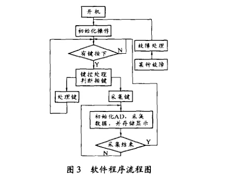 軟件共分幾個大的模塊:初始化模塊、數(shù)據(jù)采 集模塊、顯示控制模塊、按鍵控制模塊、存儲控制 模塊、回放控制模塊和故障處理模塊。針對現(xiàn)場復(fù) 雜環(huán)境,為避免偶然因素影響程序正常工作,添加 軟件陷阱“軟件看門狗”,使偶然跑飛的程序能夠 很快回到工作狀態(tài)。圖3為軟件程序流程圖。