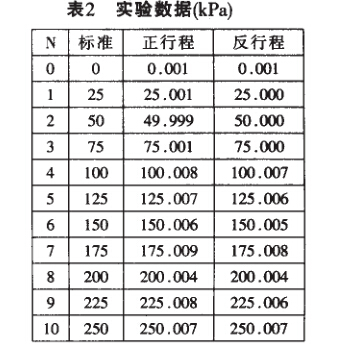 在實驗室下對250kPa壓力計進行 了標定,任取一組實驗數列于表2。
