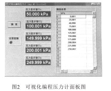 除此之外,還具有向其他應用程序 交付數據的功能。利用Windows的DDE (動態(tài)數據交換)功能,也可以向Microsoft 公司的應用軟件MS -word、MS-excel或 Matlab等軟件直接交付數據。用戶若能 熟練掌握編程方法,則無需用計算機語 言編程和手工方式裝入實驗數據,任何 人通過可視化編程非常方便地進行軟 件開發(fā)完成測量??梢暬幊虦y量的壓 力計面板圖見圖2。