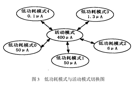 不同工作狀態(tài)的需要,如圖3,在各種低功耗模式與活動模式之間可快速由指令