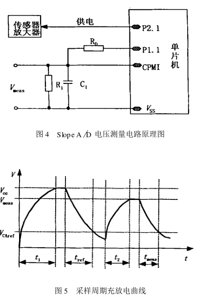 為了提高集成度和降低成本,壓力表的設(shè)計利用了 430單片機內(nèi)部集成的特殊A/b轉(zhuǎn)換 器(SbpeA/b),該A/b轉(zhuǎn)換器利用電容充放 電原理,可用于電阻、電壓、電流的轉(zhuǎn)換壓力傳 感器經(jīng)放大后為電壓信號,利用Slope A/b測 量,其電路原理如圖4