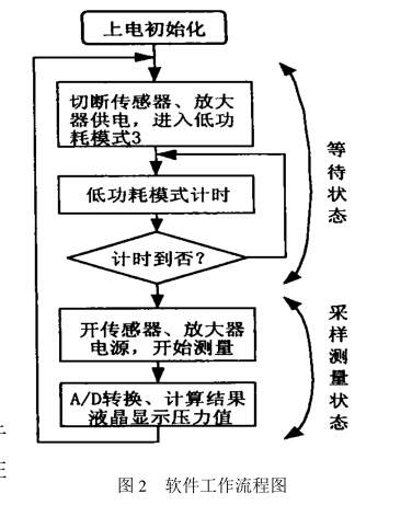 設(shè)計是圍繞如何實現(xiàn)低功耗展開的根據(jù)設(shè)計要求,傳感器橋臂電阻為8 k8,假設(shè)用3V 電池供電,電池容量為2 Ah,則儀表可連續(xù)工作200 d左右,無法滿足設(shè)計要求最初的設(shè)想 是在儀表上加裝手動開關(guān)或遙控開關(guān),在工作時打開,不工作時關(guān)閉來降低功耗這一想法很 快被否定,由于儀表可能安裝在不易接觸到的高處,遙控接收裝置要長期耗電,而且如果儀表 用于長期監(jiān)測,不論是哪一種開關(guān)都不能從根本上達到降低功耗的目的從外部控制功耗的方 案看來不可行,必須從內(nèi)部著手經(jīng)過反復(fù)推敲,我們發(fā)現(xiàn)通過單片機軟件來控制壓力傳感器 的供電和采樣以及計算和顯示測量結(jié)果是一個最優(yōu)化方案,系統(tǒng)的基本組成如圖1,單片機軟 件工作流程如圖2