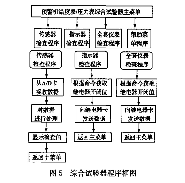 當(dāng)檢查指示器時(shí),程序可根據(jù)檢測(cè)的需要,通 過(guò)繼電器控制卡控制適配器轉(zhuǎn)換電路上相應(yīng)的繼 電器通或斷,實(shí)現(xiàn)溫度/壓力表指示器同計(jì)算機(jī)之 間的連接;與此同時(shí),繼電器控制卡控傳感器信號(hào) 產(chǎn)生電路,使其產(chǎn)生兩個(gè)高精度電阻,以模擬壓力 傳感器,其產(chǎn)生標(biāo)準(zhǔn)的傳感器信號(hào)加到指示器上, 來(lái)完成對(duì)溫度/壓力指示器的效驗(yàn),如果指示器指 示值在其誤差范圍內(nèi),則說(shuō)明指示器工作正常,否 則故障。PC104采集卡還用于測(cè)量電壓/電流傳感 器輸出的代表被測(cè)儀表所需的電壓、電流大小,以 檢測(cè)供電電壓和儀表所消耗的電流是否符合要求。 電源包括3個(gè)直流電壓模塊,為設(shè)備提供所需電 源。