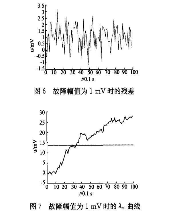 根據(jù)曲線分析,當(dāng)Am = 13. 96時(shí),A?>:rD1,說(shuō) 明此時(shí)雖然部件故障幅值為1 mV,沒(méi)有超過(guò)規(guī)定 誤差值1. 5 mV,但在噪聲影響下,系統(tǒng)已經(jīng)故障。 如每0.1 s采樣一次,在3. 6 s時(shí)溫度表傳感器出 現(xiàn)軟故障。