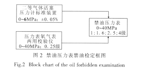 通過二等氣體活塞壓力計標準裝置與壓力表 氧氣表兩用校驗儀組合成禁油壓力表計量標準, 實現(xiàn)禁油檢定,完成禁油壓力量值傳遞工作。