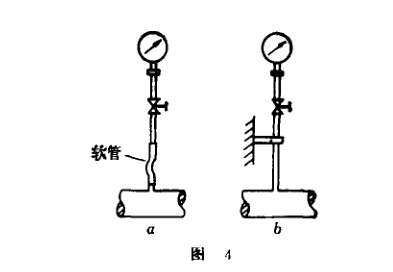 (3)連接管固定減震法:把靠近壓力表 的連接管處固定在無(wú)震動(dòng)或震動(dòng)小的部位上 (見(jiàn)圖4)。