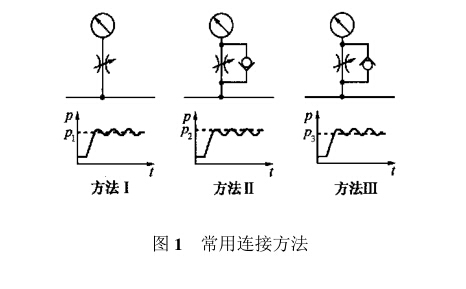 壓力表用以測量流體傳動(dòng)管道中某工作點(diǎn)的壓 力,使用時(shí)為防止壓力表受沖擊損壞,一般不將其直接 接入管道,常用的有以下3種連接方法(見圖1)。對 靜壓力來講,3種接法的測量結(jié)果相同;但當(dāng)管道中的 壓力有脈動(dòng)或沖擊時(shí),3種連接方法對測量結(jié)果產(chǎn)生 不同的影響。