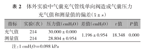 2.1.2充氣管線單向閥造成氣囊壓力充氣值和測量 值的偏差(表2):經(jīng)過214次的反復(fù)實驗,得到氣囊 接口單向閥斷開和連接造成氣囊壓力充氣值和測量 值之間的偏差,差異有統(tǒng)計學(xué)意義(t=18.348,P= 0.000)。