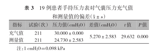 3.2充氣管線單向閥在間斷測量中造成測量值與 氣囊實際壓力值存在明顯偏差:除手持壓力表本身 的因素外,采用充氣后斷開、測量時再連接的方法進 行氣囊壓力檢測時,氣囊充氣管線單向閥在與壓力 表斷開和連接過程中的漏氣也是造成測量值與氣囊 實際壓力值存在偏差的原因之一。由于充氣管線單 向閥的設(shè)計特點,不同操作者在進行氣囊壓力測量 時手部操作存在差異,導(dǎo)致漏氣,這個損失值平均為 (1.196±0.954) cmH2O,本研究稱之為“誤差損失 值”。“誤差損失值”難以避免,只能盡量減小。