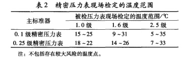 根據(jù)表1數(shù)據(jù),按照測(cè)試不確定度比不小于4:1的 要求,精密壓力表開展艦船壓力表現(xiàn)場(chǎng)檢定的溫度范 圍見表2。