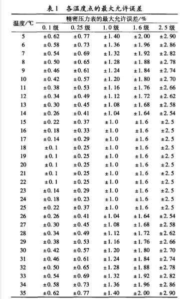 6級(jí)、2. 5級(jí)艦船壓力表在5 ~ 35T之間各溫度點(diǎn)的 最大允許誤差見表1。