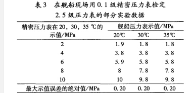 從表1可知,現(xiàn)場(chǎng)檢定中隨著現(xiàn)場(chǎng)溫度偏離實(shí)驗(yàn) 室檢定的環(huán)境溫度,艦船壓力表和精密壓力表的最大 允許誤差的絕對(duì)值將分別增加0^+3)。其 中,At+3)比相應(yīng)溫度點(diǎn)艦船壓力表的最大允許誤 差的絕對(duì)值小2個(gè)數(shù)量級(jí),對(duì)現(xiàn)場(chǎng)檢定的示值誤差的 影響可忽略不計(jì)。因此,以精密壓力表為主標(biāo)準(zhǔn)器進(jìn) 行現(xiàn)場(chǎng)檢定合格判定時(shí),艦船壓力表的示值誤差不得 大于其在表1相應(yīng)溫度點(diǎn)的最大允許誤差。