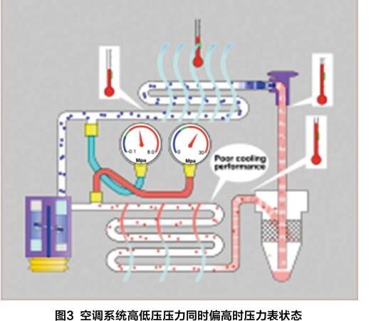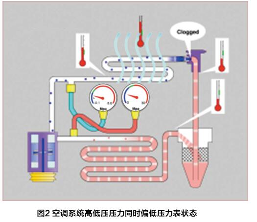 在檢測汽車空調(diào)的過程中,如果檢測到高壓側(cè)和低壓側(cè)的壓 力同時(shí)低于正常值(圖2),則可能的故障原因有:系統(tǒng)制冷劑加注 量不足、壓縮機(jī)與干燥罐之間有堵塞。
