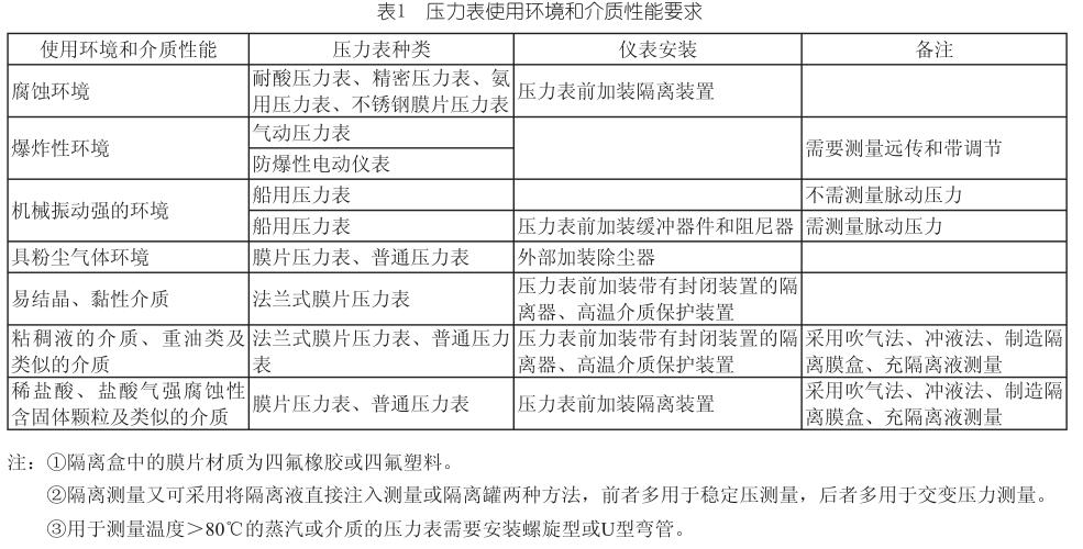 根據(jù)壓力表使用環(huán)境和被測(cè)介質(zhì)的不同,如環(huán)境溫度、腐蝕情況、振動(dòng)、介質(zhì)易燃易爆等,選擇不 同類型的壓力表,詳見(jiàn)表1。