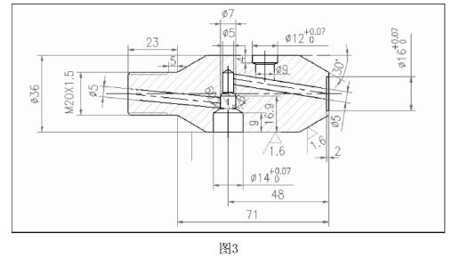 斜孔和斜面的加工工藝:為了使閥體看上去更美觀,更小巧、就簡 潔,所以是閥體盡可能的縮小長度。所以采用在閥體內(nèi)打斜孔以減少長 度。如圖3: