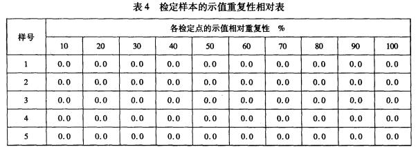 若設(shè)定同一檢定點(diǎn)重復(fù)校準(zhǔn)讀數(shù)的最大值為 內(nèi)由式2得到的各檢定點(diǎn)的示值重復(fù)性相對(duì)誤差如 ,最小值為,示值重復(fù)性相對(duì)誤差為u2,則有: 表4所示。 u2 =(( P^x—P-iJ /p。)xlOO (式2)