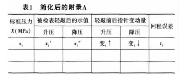 在此僅就與操作有關(guān)的項目進行闡述。附錄A中, 有被檢表的分度值(設(shè)為6),有與被檢表準確度等級有 關(guān)的允差范圍(設(shè)為±5),有升壓和降壓時的被檢表輕敲 后示值(設(shè)為x/和x,"),有輕敲前后被檢表的指針變動量 (設(shè)為變,丨、變,丨),有回程誤差(設(shè)為t),簡化的附錄A 如表1所示。