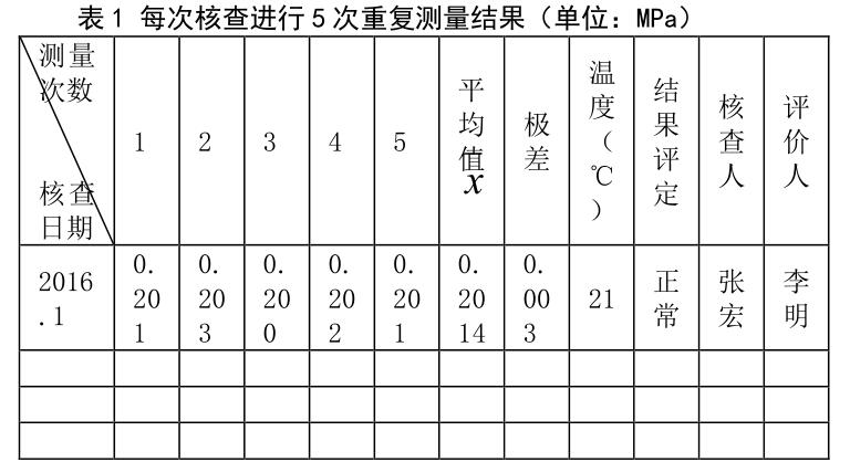 (3)核查測量過程:用精密壓力表對普通壓力表在2MPa 點上重復做4組、每組5次重復測量,測量時的環(huán)境溫度為 21C。依據(jù)所測數(shù)據(jù)求得平均值X為2.0028MPa、極差值7 為 0. 002MPa。
