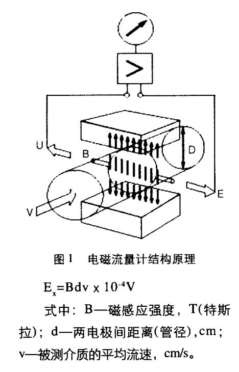 電磁流量計由變送器和轉(zhuǎn)換器兩 部分組成,兩者之間用連接線(包括勵 磁線、信號線)相互連接。變送器是基 于電磁感應(yīng)定律工作的,如圖1所 示,被測介質(zhì)垂直于磁力線方向流 動,因而在于介質(zhì)流動和磁力線都垂 直的方向上產(chǎn)生一感應(yīng)電動。