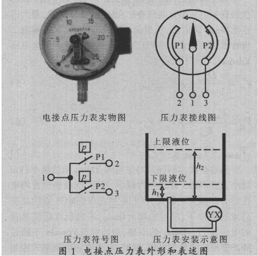 電接點(diǎn)壓力表通過管道與被控制的液體連通,液位的變化轉(zhuǎn)變?yōu)閴毫Φ淖兓?而壓力的變化,轉(zhuǎn)變?yōu)?/span> 壓力表內(nèi)開關(guān)觸點(diǎn)的變化,表征為開關(guān)的閉合或打開,最終驅(qū)動(dòng)或停止電動(dòng)機(jī)-水泵機(jī)組的運(yùn)行狀態(tài),達(dá)到 控制液位的目的。常用電接點(diǎn)壓力表的結(jié)構(gòu)等如圖1所示。