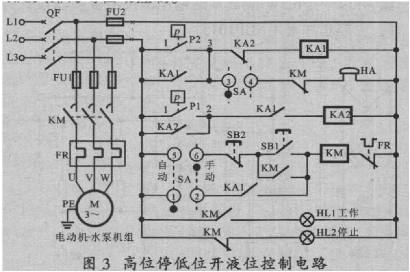 只需對(duì)圖2液位控制電路的接法稍加改造如圖3,即可改造為高液位排水、低液位停機(jī)電路,可用于