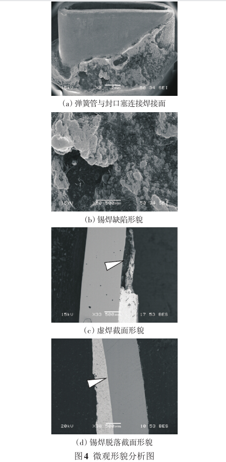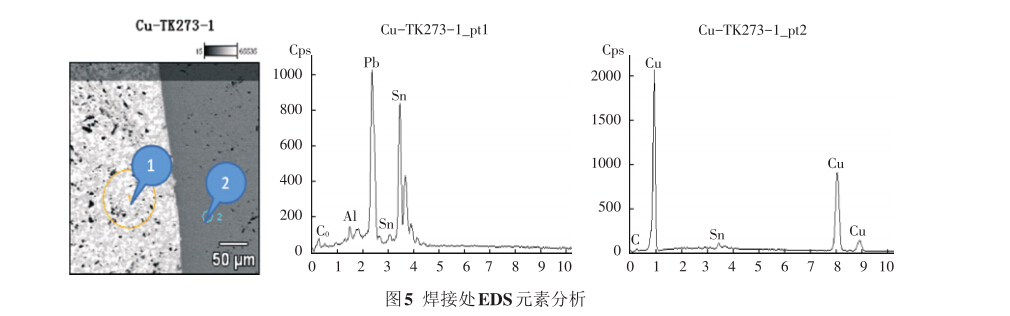 對焊接處進行微區(qū)能譜分析,如圖5所示。其 中彈簧管為純銅制造,焊料主要成分為Pb和Sn,有 微量的Al、Co雜質元素。雜質元素明顯會影響焊料 的潤濕性和流動性,加之封口塞的幾何外形容易有 氣隙和裂紋,使焊接點的強度下降。
