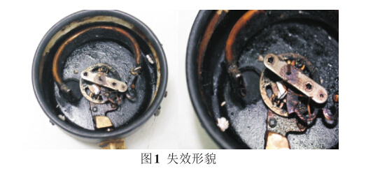 彈簧管式壓力表是以彈簧管為敏感元件的壓 力測量儀。彈簧管在壓力和真空的作用下,產生彈 性形變,引起管端位移,其位移通過扇形齒輪傳動機 構進行放大,傳遞給指示裝置,顯示被測壓力。油 田采油樹上的油壓壓力表用來監(jiān)測油井中油管的 壓力,給操作人員和技術人員提供重要的參數信 息。某油田巡井人員在巡檢時發(fā)現(xiàn)井場大面積污 染,經檢查確認油污是由采油樹上型號為Y-100的 壓力表密封失效導致,表內全部是油污,表盤破 裂。該壓力表失效形貌如圖1所示。油田后來又發(fā) 生幾起壓力表失效事故均為同期購人的型號Y-100 壓力表,這給該油田安全生產活動帶來極大的損 失。為找出該類壓力表失效原因,避免此類事故再 次發(fā)生,對該起壓力表失效事故進行了調查分析。